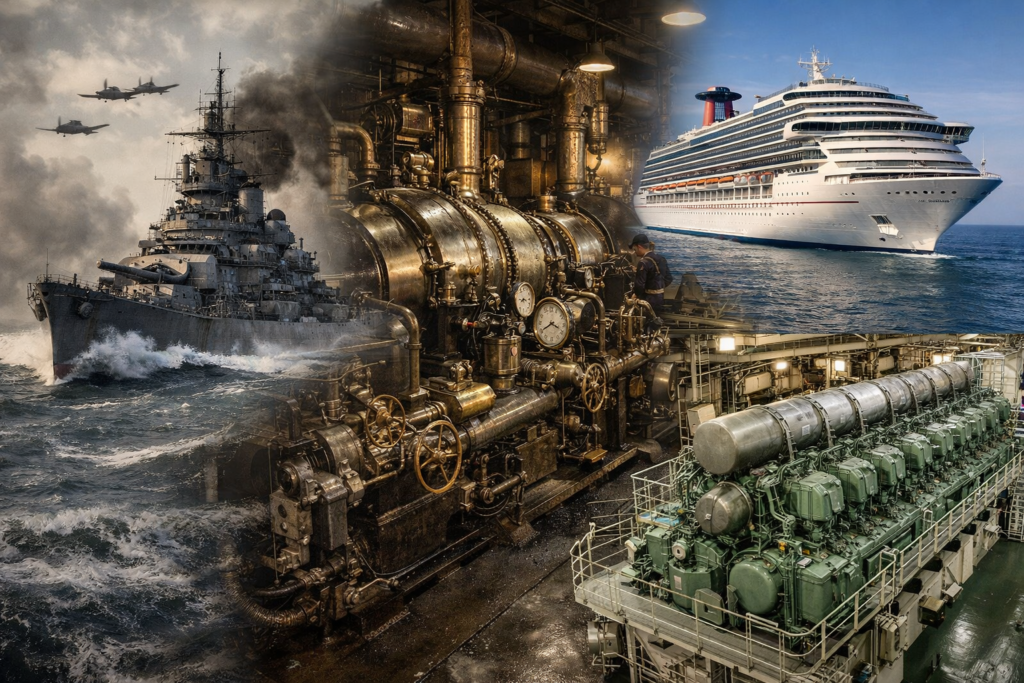 Sejarah mesin kapal pesiar tidak bisa dipisahkan dari evolusi mesin kapal perang yang terjadi selama abad ke-19 dan terutama dua Perang Dunia besar. Dari mesin uap dan turbin yang dulunya dirancang untuk kapal perang, teknologi tersebut bertransformasi menjadi konfigurasi mesin yang kita lihat di kapal komersial dan kapal pesiar masa kini. Proses ini bukan hanya meningkatkan performa kapal tetapi juga memastikan keselamatan, kenyamanan, serta efisiensi energi dalam pelayaran.